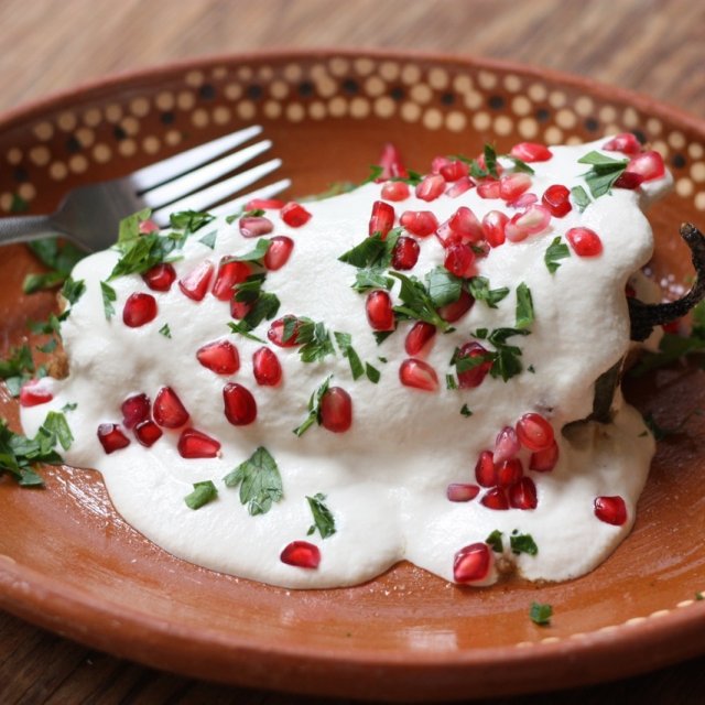 Se cree que fueron las madres agustinas del Convento de Santa Mónica, en Puebla, quienes en 1821 crearon los chiles en nogada en honor a Agustín de Iturbide. Desde entonces este platillo es uno de los más representativos de México y mi preferido. Cada año, en esta temporada, de agosto y septiembre, compro los ingredientes en el Mercado de Jamaica y dedico una mañana entera a pelar chiles y picar frutas, es delicioso.
